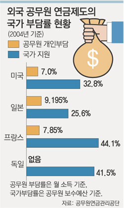 독일 정부는 2004년부터 공무원연금 급여 수준을 퇴직 직전 월급의 75%에서 67%로 대폭 깎았다. 물론 공무원들의 저항이 거셌지만 당시 슈뢰더 정부는 대(對)국민 설득을 통해 공무원들을 압박했다.