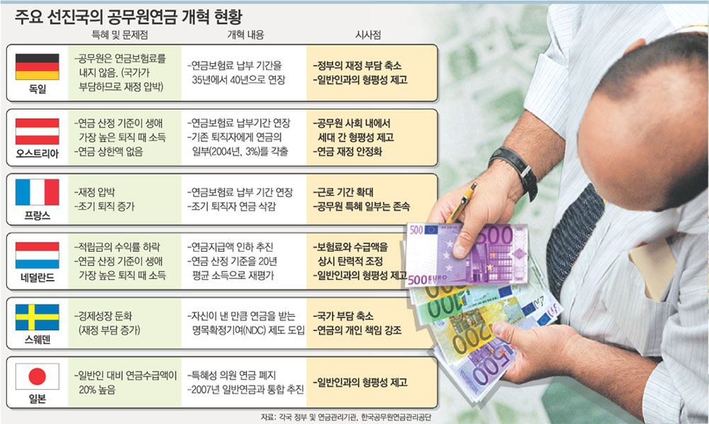 유럽 각국에서는 요즘 국민연금 못지않게 공무원연금 개혁이 진행 중이다.