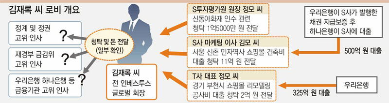 대출은 S사가 500억 원어치의 채권을 발행해 우리은행이 이를 지급보증하고 하나은행이 이 채권을 담보로 500억 원을 대출하는 방식으로 이뤄졌다. 김 씨는 또 지난해 6월 경기 부천시 T쇼핑몰 리모델링을 추진하던 T사 대표 정모 씨에게서 “공사비 등을 우리은행에서 대출받을 수 있도록 은행 관계자에게 영향력을 행사해 달라”는 청탁을 받고 정 씨가 우리은행에서 325억 원을 대출받도록 도와준 뒤 그 대가로 2억 원을 받아 챙겼다.