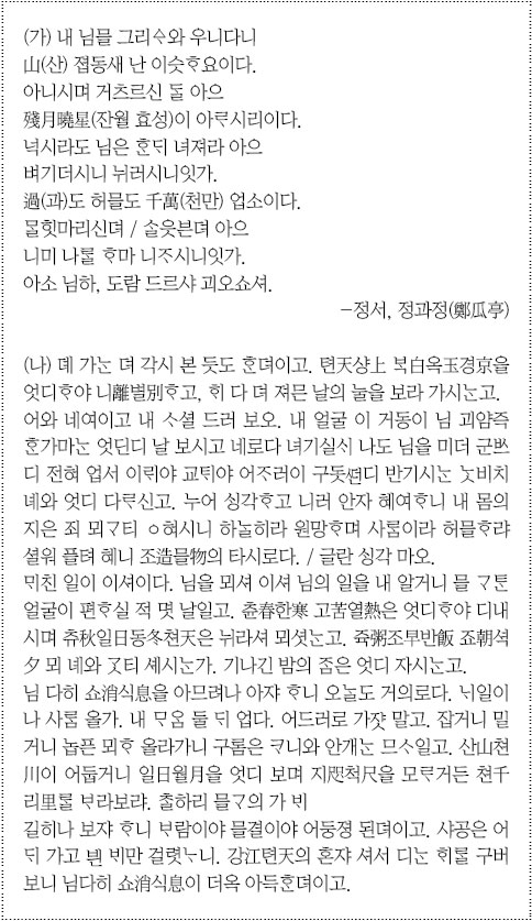 (가)와 (나)는 유배지에서 임금을 그리워하는 정을 절실하고 애달프게 노래하고 있다는 공통점을 갖고 있다. 그러나 두 작품은 시적 화자의 ‘죄(잘못)에 대한 인식’과 ‘임에 대한 정서 및 태도’ 등의 측면에서 차이점 또한 보이고 있다.