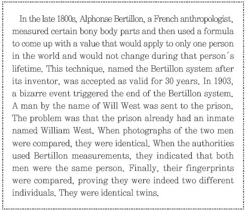다음 글에 설명된 Bertillon system과 fingerprint에 관한 내용에 근거하여 아래 도표를 완성하시오. 단, (4)번의 경우 4줄 이상 쓰지 않으면 2점 감점함. [총 6점]