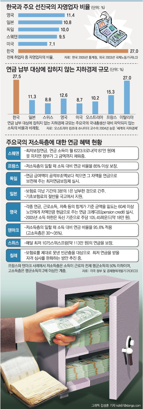 그러나 연금에 가입할 처지가 못 되거나 가입을 회피하는 자영업자와 극빈층에 대한 노후보장, 그리고 여기에 들어가는 막대한 재정은 한꺼번에 잡기 힘든 두 마리 토끼로 선진국도 고민스러워 하기는 마찬가지였다.