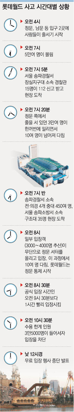 ▽수용 인원의 2배 넘은 인파=롯데월드 정문과 남문 앞에 인파가 몰리기 시작한 것은 이날 오전 4시경부터다.