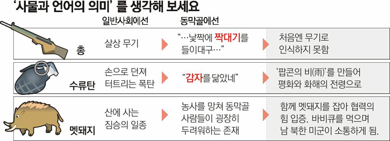 총부리를 들이대는 인민군에게 동막골 사람들은 이렇게 답합니다. 수류탄을 보고도 마을 사람들은 “감자를 닮았네” 하면서 전혀 두려워하지 않죠. 바로 이 장면에 ‘사물과 언어의 의미’라는 철학적인 문제가 내포되어 있어요. 어떤 사물이나 말의 뜻은 우리가 태어날 때부터 저절로 알고 있는 게 아니라, 후천적인 학습이나 경험을 통해 비로소 습득하게 된다는 거죠. 동막골 사람들은 자신들이 경험하지 못한 총은 두려워하지 않는 대신 농사를 망쳐 놓는 멧돼지는 두려워하잖아요?