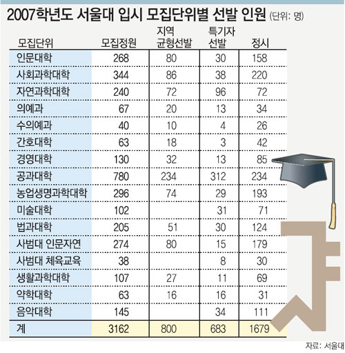 서울대는 또 2007학년도 모집정원을 전년도보다 63명을 줄인 3162명으로 정했으며, 이공계 기피 현상을 해소하기 위해 자연계열 특기자 전형의 지원 자격을 완화했다.