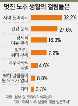 멋진 노후 생활의 걸림돌로는 자녀 뒷바라지가 32.2%로 첫손에 꼽혔다. 다음으로 건강, 자금 부족, 소일거리 부족 등 순이었다.