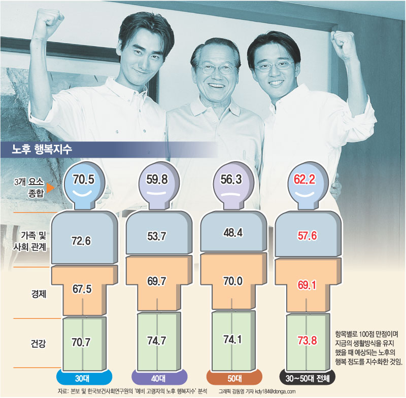 본보와 보건사회연구원의 ‘예비 고령자의 노후 행복지수’ 조사에서 30대의 행복지수는 70.5점으로 50점대에 머문 40, 50대보다 높았다. 현재 생활 방식으로 볼 때 30대가 40, 50대보다 좀 더 행복한 노후를 맞게 될 것이란 얘기다.