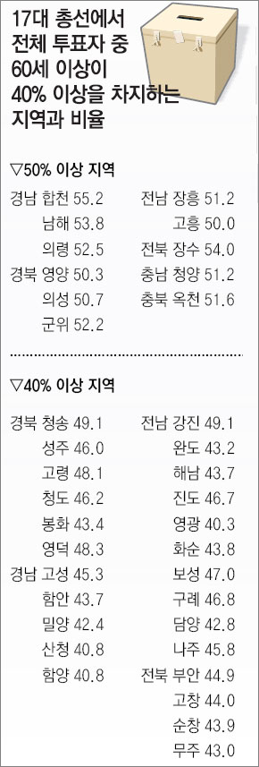 이 말을 가장 실감 나게 보여 준 사례가 바로 지난 17대 총선이었다. 2004년 4월 15일에 실시됐던 총선의 선거구별 투표 결과 분석은 그해 9월에 나왔다. 중앙선거관리위원회가 내놓은 이 자료는 이제 우리나라의 각종 선거에서 시니어(실버)층이 정치 세력으로 얼마나 큰 힘을 발휘할 수 있는지를 여실히 보여 주고 있다. 시니어층의 표심을 얻지 않고서는 선거에서 당선될 생각을 버려야 한다는 메시지를 담고 있다. 특히 시골 지역에서는 더욱 그렇다.》