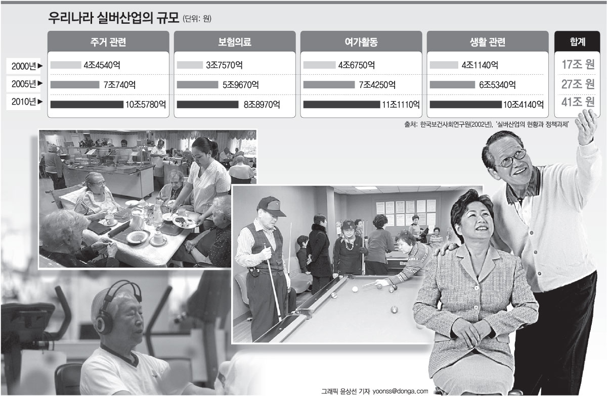 이와 관련해 한국보건사회연구원은 우리나라의 시니어산업 시장이 2000년에는 17조 원 규모였으나 지난해에는 27조 원으로 늘어났으며 2010년에는 약 41조 원 규모로 확대될 것으로 전망했다.