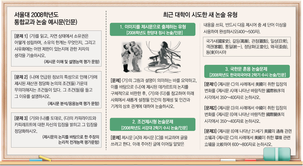 통합논술에서도 이런 출제 방식이 강화될 전망이다. 단일 교과 제시문이나 단수 논제를 전개하는 1000∼2500자의 긴 고전적 논술이 사라질 수 있다.