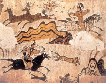 1. 위의 그림은 고구려 문화재인 ‘수렵도’입니다. 이 그림을 보고 떠올릴 수 있는 ‘고구려인의 기상’과 그 이유를 써 보세요.