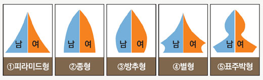 ③은 방추형 구조로 종형에서 출산율이 더욱 저하돼 총인구의 감소까지 예측 가능한 지역이다. 이쯤 되면, 방추형 구조가 나타나는 지역은 생산연령 인구(15∼64세) 증가 속도보다 부양 인구(0∼14세, 65세 이상) 증가 속도가 더 빨라 국가 경쟁력 자체를 위협받는 상황이 나타난다.