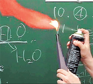 스프레이 통속의 높은 압력 때문에 액체상태로 들어있던 충전가스가 기체로 뿜어져 나오면서 주변의 열을 흡수하게 되어 차가워지는 것이다. 스프레이로 실험을 할 경우 불에 닿지 않도록 특히 조심해야 한다.