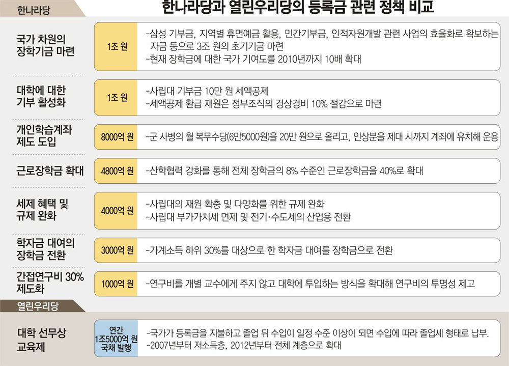 한나라당은 8조 원의 절반인 4조 원을 마련하면 등록금을 반값으로 줄일 수 있다는 계산이다. 구체적으로는 △국가 차원의 장학기금 1조 원 △근로장학금을 4800억 원으로 확대 △군 사병 월급 예치 뒤 등록금 활용 8000억 원 △저소득층 대여 학자금의 장학금 전환 3000억 원 △사립대에 10만 원 기부 시 11만 원 세액 공제로 1조 원 확보 등이다.