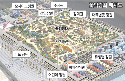 ▽미리보는 전시장=1만6000평에 이르는 실내 전시장은 테마별로 나뉜 7개 정원과 전시관, 체험관, 무역상담실, 판매장 등으로 나뉘어 있다.