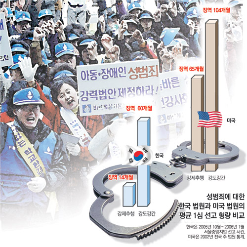 《‘한국은 성폭행범의 천국’이라고 해도 할 말이 없을 것 같다. 한국 법원의 중견 판사가 한국 성폭행 범죄자의 양형(量刑)을 비교 분석한 결과를 보면 그렇다. 성폭행 범죄자가 집행유예 등으로 풀려나는 비율은 미국은 기껏해야 20% 수준인 데 반해 한국에서는 50%가 넘는다. 또 강제추행 범죄자에 대한 징역 형량은 미국에서는 평균 65개월인 반면 한국은 4분의 1에도 못 미치는 14개월인 것으로 나타났다.》