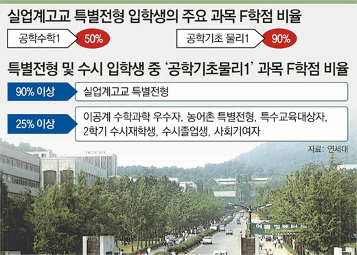 ‘공학기초물리1’에서는 실업계 전형 입학생의 90%가 F학점을 받았고 그 가운데 절반이 2학기 수강을 포기했다. 2학기에 ‘공학기초물리2’를 수강한 실업계 전형 입학생의 절반이 낙제했다.
