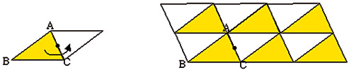 일단 임의의 예각삼각형으로 예를 들자면 테설레이션 무늬가 만들어 지는 과정은 다음과 같다. 아래 그림과 같은 삼각형 ABC에서 삼각형 ABC를 선분 AC의 중점에 대한 점대칭(또는 180°회전이동)한 삼각형을 그린 후, 두 삼각형을 각각 적절히 평행이동하면 된다.