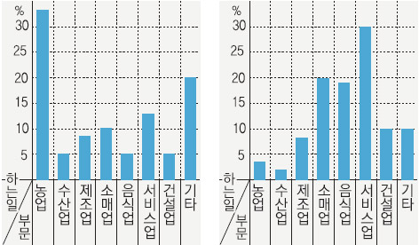 2. 이 표에서 알 수 있는 것처럼 두 고장의 부모님들이 많이 하는 일이 서로 다른 까닭을 간단히 쓰세요.