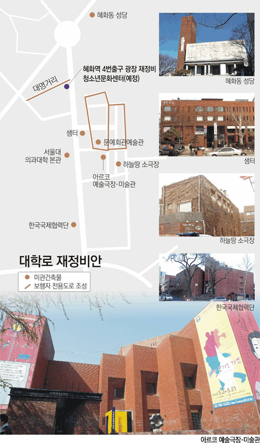 ▽걷고 싶은 거리 조성=서울대 의대 본관, 혜화동 성당, 샘터, 한국국제협력단, 하늘땅 소극장, 아르코 예술극장·미술관 등 대학로에는 보존할 만한 가치가 있는 건물들이 있다.