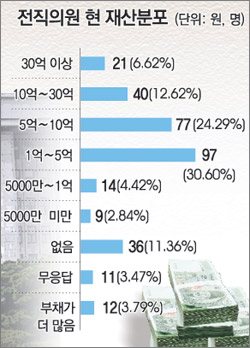 ▽15, 16대는 ‘전관예우’=15, 16대 국회의원 출신(72명)만을 대상으로 한 조사에서는 월수입 300만 원 이상이 52.0%로 전직 의원 전체(36.7%)보다 많았다. 재산도 15, 16대 국회의원은 5억 원 이상이 58.5%로 역시 전직 의원 전체(40.2%)보다 많은 것으로 분석됐다.
