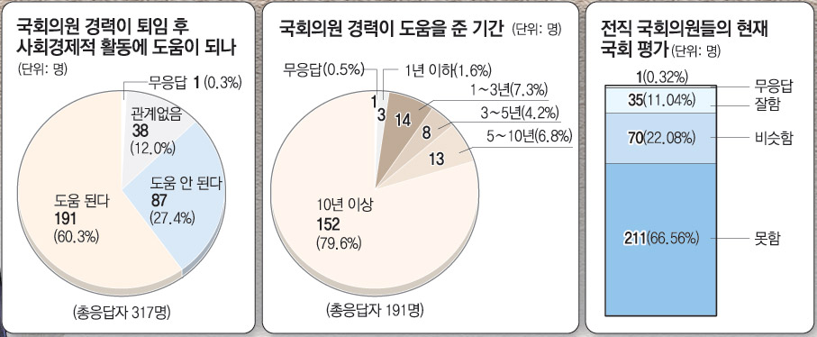 정치판의 상식에 속하는 얘기지만 실상은 좀 달랐다. 조사 결과 전직 의원 10명 중 6명은 국회의원 경력이 퇴임 후 사회 경제적 활동에 도움이 된다고 생각하고 있었다. 물론 ‘마이너스’라고 말하는 이도 적지 않다.
