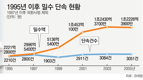 밀수가 점점 늘어나고 수법도 교묘해지고 있다. 1990년대 초반까지 관세청이 적발한 밀수액은 2000억 원대를 밑돌았으나 2001년 처음으로 1조 원을 넘어섰다.