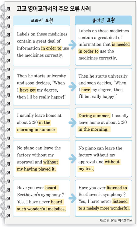 국회 교육위원회 소속 한나라당 이주호(李周浩) 의원은 미국에서 고교와 대학을 마친 대학원생과 원어민 대학 교수를 통해 고교 영어 검정교과서 15종 가운데 5종을 점검한 결과 30여 건의 오류를 발견했다.