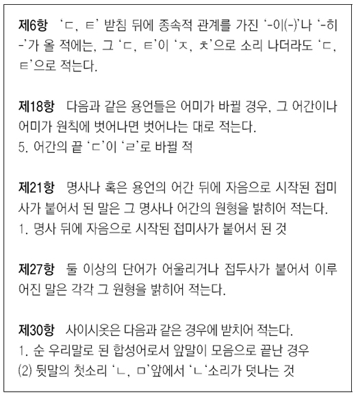 1. 다음은 한글 맞춤법 통일안 중 일부이다. 각 항에 해당하는 예시(밑줄 친 부분)를 적절하게 제시하지 못한 사람은 누구인지 말해 보시오.