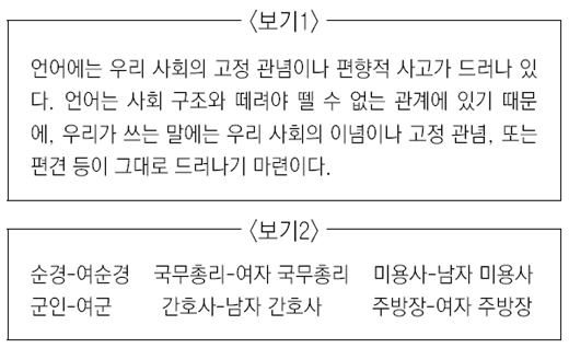 4. <보기 1>은 언어가 사회의 특징적 모습을 반영한다는 설명이다. <보기 2>의 어휘들은 우리 사회의 어떤 모습을 반영한 것인지 구체적으로 설명하시오.
