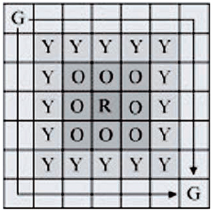 4. 어느 지하철역의 벽면에 오른쪽 그림과 같이 타일을 붙이려고 한다. 각 타일은 정사각형 모양으로 되어 있고, 한가운데에서부터 무지개의 일곱 색깔을 순서대로 반복하여 배치하고자 한다. 첫 번째는 한가운데에 빨간색 타일을 붙이고, 두 번째는 주황색 타일로 둘러싸고, 세 번째는 노란색 타일로 둘러싼다. 이런 식으로 100번째까지 만드는 데 필요한 빨간색 타일의 개수를 , 초록색 타일의 개수를 라 할 때, -의 값을 구하시오. (단, R, O, Y, G,… 는 각각 빨간색, 주황색, 노란색, 초록색을 의미한다.)