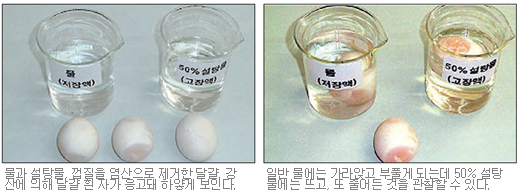 일반 물에서는 달걀보다 물의 농도가 더 낮으므로 반투과성 막을 통해 달걀 속으로 물이 흡수되어 원래 크기보다 부푼 것이고, 50% 설탕물에서는 반대로 설탕물 농도가 더 높으니 달걀 속 수분이 설탕물로 빠져나와 크기가 줄어든 것이다. 이럴 때 물을 달걀의 농도보다 더 낮은 ‘저장액’, 50% 설탕물을 더 농도가 높은 ‘고장액’이라고 부른다.