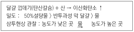 일단 달걀을 넣으면 일반 물에서는 달걀이 가라앉고 설탕물에서는 달걀이 뜨는 것을 볼 수 있을 것이다. 달걀의 밀도가 물보다는 높고 설탕물보다는 낮기 때문이다.