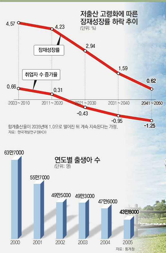 하지만 지난해 합계출산율이 1.08로 나타남에 따라 현실은 가장 비관적인 시나리오보다도 더 비관적이어서 성장잠재력은 훨씬 빨리 떨어질 것이 확실하다.
