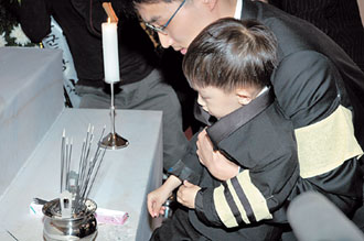 ![]() 에어쇼 도중 산화한 김도현 소령의 아들 건우 군이 8일 공군 제8전투비행단에서 열린 영결식에서 분향하고 있다. 사진 제공 공군 |