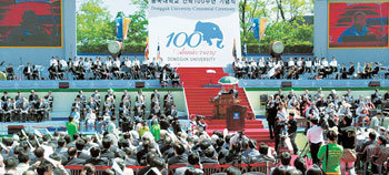 동국대 건학 100주년 기념식이 8일 오전 교내 만해광장에서 열렸다. 동국대는 12, 13일 재학생과 졸업생이 함께 100주년을 자축하는 ‘달빛 연등축제’와 ‘동국인 한마당’ 행사를 열 계획이다. 원대연  기자