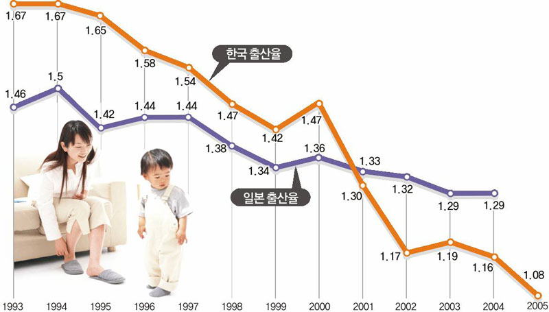 더욱 큰 문제는 우리보다 앞서 저출산을 경험한 일본 등 선진국보다 출산율 저하의 속도가 빨라 충격파가 크다는 것. 일본의 경우 1989년 합계출산율은 1.57명이었지만 지난해는 1.29명이었다.