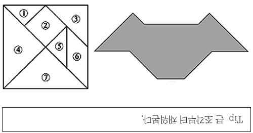 1. 정사각형 모양의 색종이를 다음의 왼쪽 그림과 같이 선을 따라 잘랐다. 이 중에서 여섯 조각을 골라서 다음의 오른쪽 그림과 같이 만들 때, 반드시 사용하지 않아도 되는 조각을 찾아 그 번호를 모두 써라.