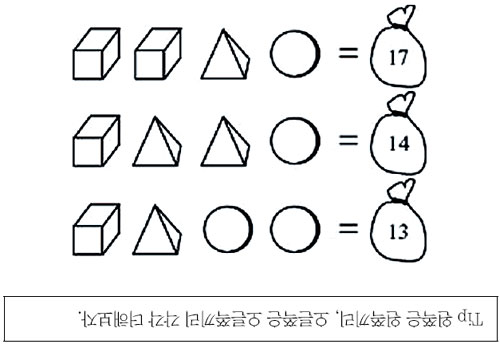 1. 주사위 모양, 뿔 모양, 공 모양의 물건을 아래 그림과 같이 주머니에 넣어 무게를 달면, 첫째 줄은 17㎏, 둘째 줄은 14㎏, 셋째 줄은 13㎏이 된다. 이때, 주사위 모양 1개의 무게는 몇 ㎏인가?