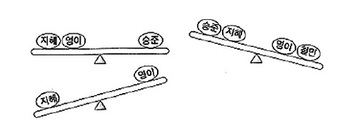 3. 지혜, 영이, 승준, 철민이가 시소에 탔더니 다음과 같이 되었습니다. 무거운 사람부터 차례대로 이름을 쓰시오.
