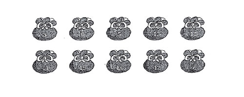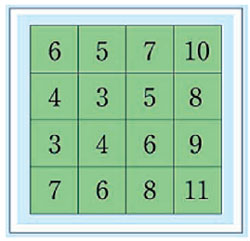 4. 다음 그림과 같이 적힌 수만큼의 구슬이 들어 있는 10개의 주머니를 재호, 기범, 상길, 우현 네 사람이 나누어 가졌다. 재호, 기범, 우현이는 각각 3개씩의 주머니를 가졌고, 그 주머니에 적힌 수의 합이 각각 40, 16, 26이다. 상길이가 남은 주머니 한 개를 가졌다면, 구슬이 10개 들어 있는 주머니를 가진 사람은 누구인지 알아보아라. (단, 구슬이 두 번째로 많이 들어있는 주머니는 재호가 가졌다.)