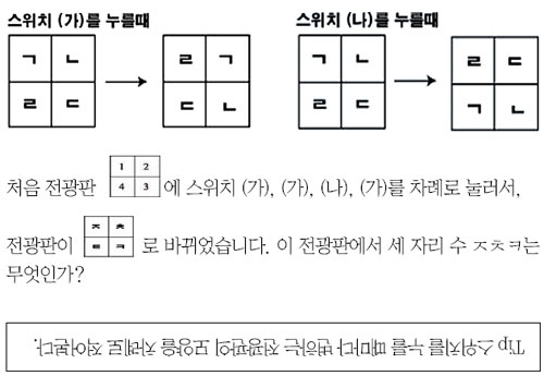 2. 두 개의 스위치 (가)와 (나)가 있는 전광판이 있다. 스위치 (가)와 (나)를 누를 때, 전광판은 각각 다음과 같이 바뀐다고 한다.