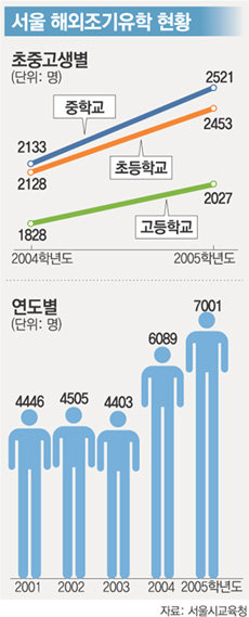 서울지역 초중고교 유학생은 2001학년도 4446명, 2003학년도 4403명으로 유지되었으나 2004학년도에 38% 증가했다. 이후 2005학년도에 다시 15%의 증가세를 보여 매일 19명의 초중고교생이 공부하러 한국을 떠난 셈이다.