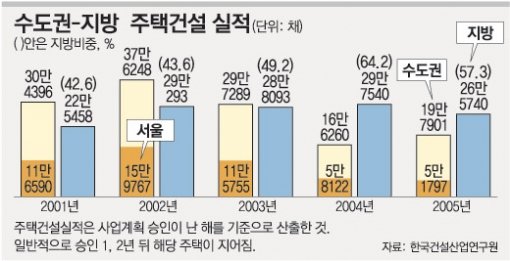 보고서에 따르면 지방의 주택건설실적(사업계획 승인 기준)은 2003년까지 전체 물량의 40%대에 머물렀으나 2004년 전체의 64.2%, 2005년에는 57.3%를 나타냈다.