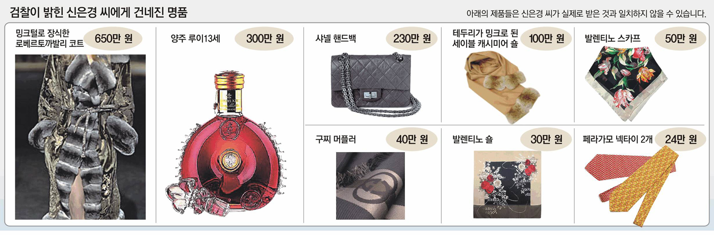 서울중앙지검 공안1부(부장 송찬엽·宋讚燁)는 “신 씨가 받은 8종류의 명품은 모두 1424만 원어치”라며 “신 씨는 자신이 좋아하는 체리 1상자도 ‘덤’으로 받았다”고 밝혔다.