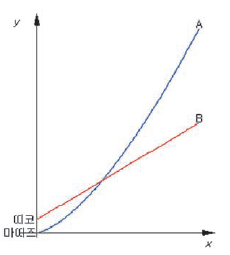 오른쪽의 그림처럼, 평면 위에 두 개의 도로 A, B가 있다. 도로 A는 점(0,0)에서 출발하여 곡선