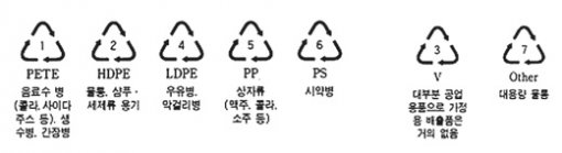 주변의 플라스틱 용기를 한번 뒤집어 보자. 아래와 같은 재활용 마크와 영어 약자를 볼 수 있다.