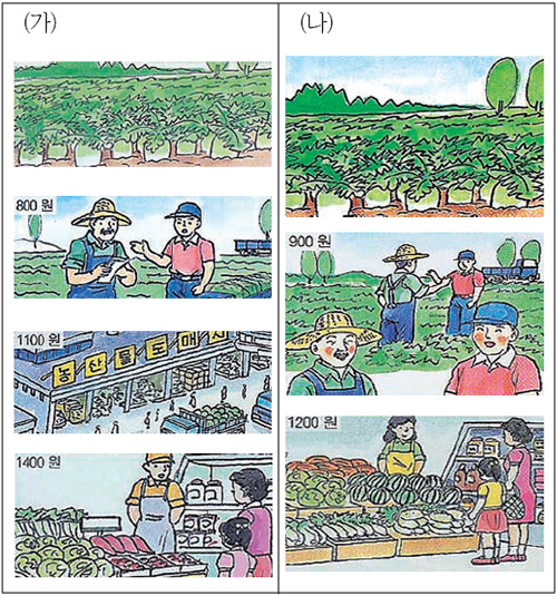 1. (가)와 (나) 그림에서 생산자가 받는 가격과 소자가 사는 가