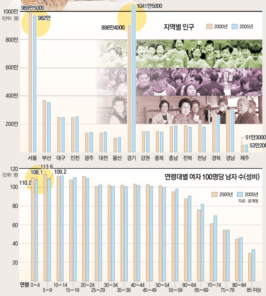 0∼4세의 성비는 2000년 110.2명에서 2005년 108.1명으로 2.1명 줄었다. 5∼9세의 성비는 같은 기간 4.4명 감소했다. 그만큼 남자의 비중이 작아진 셈.
