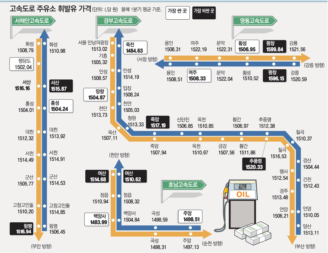 하지만 고속도로 휴게소끼리도 휘발유 값이 L당 최대 110원까지 차이가 나는 만큼 상대적으로 값이 싼 주유소를 알아둘 필요는 있다.